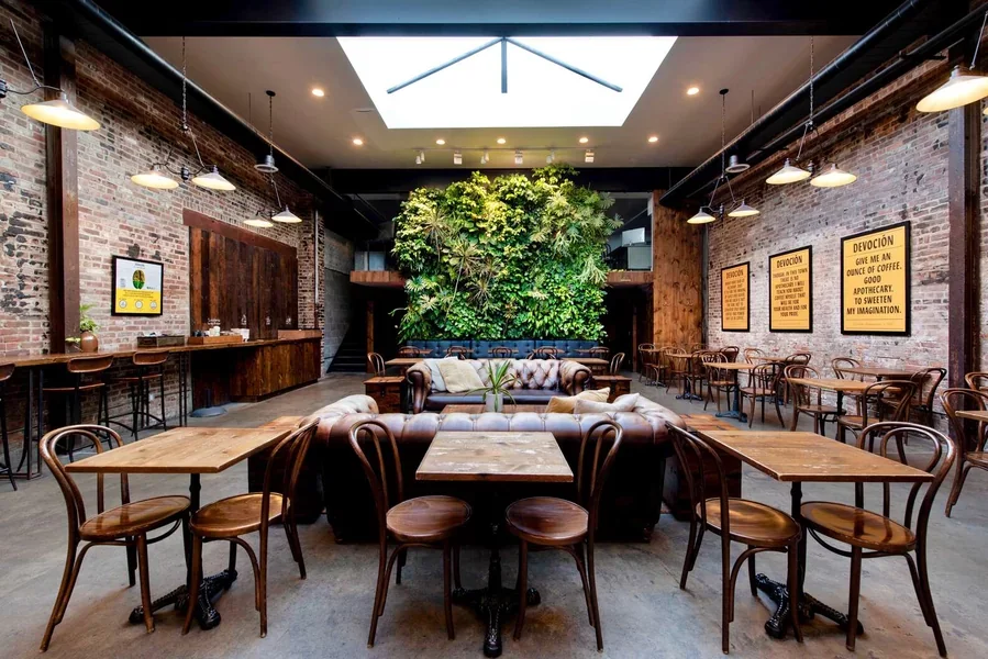 Devoción café in Brooklyn, known for sourcing fresh coffee directly from Colombian farms.